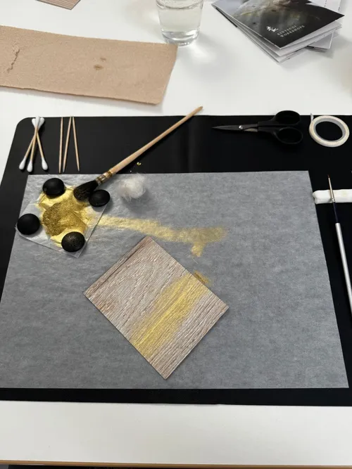 Die Teilnehmer*innen gestalten ein Bild im Stil der japanischen "Kintsugi"-Methode, wobei sie die "Maki-e" Streutechnik erlernen, um die Bruchstellen mit Gold zu betonen. Gleichzeitig vertiefen sie ihr Verständnis für die Wabi-Sabi Ästhetik, die die Schönheit in der Unvollkommenheit würdigt.
