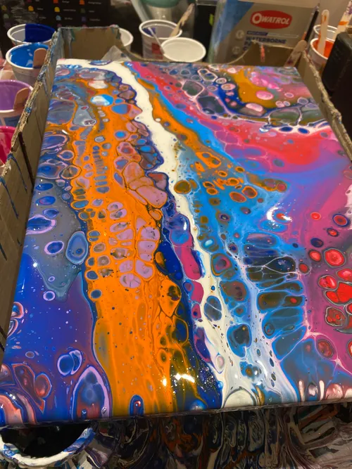 Dein Pouringbild ist am Kurstag noch sehr feucht. Wenn Du es sofort mitnehmen möchtest, brauchst Du eine Plane oder große Schachtel für's Auto.