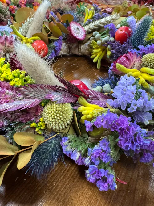 In diesem Workshop wirst Du lernen, wie man einen natürlichen Kranz bindet. Er wird aus frisch wie auch aus getrockneten Blumen gestaltet.