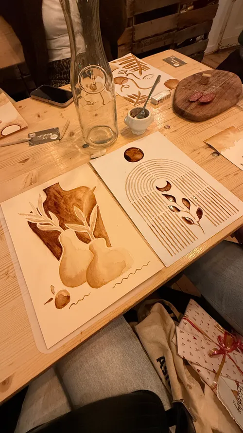 In diesem kreativen Workshop experimentierst Du mit drei verschiedenen Kaffee-Texturen – darunter eine mit glänzendem Lackeffekt. Ob frei gestaltet oder mit Schablonen, am Ende nimmst Du ein beeindruckendes DIN-A4-Kunstwerk mit nach Hause. Der perfekte Kurs für alle, die Kunst mal anders erleben wollen – inklusive Überraschung!
