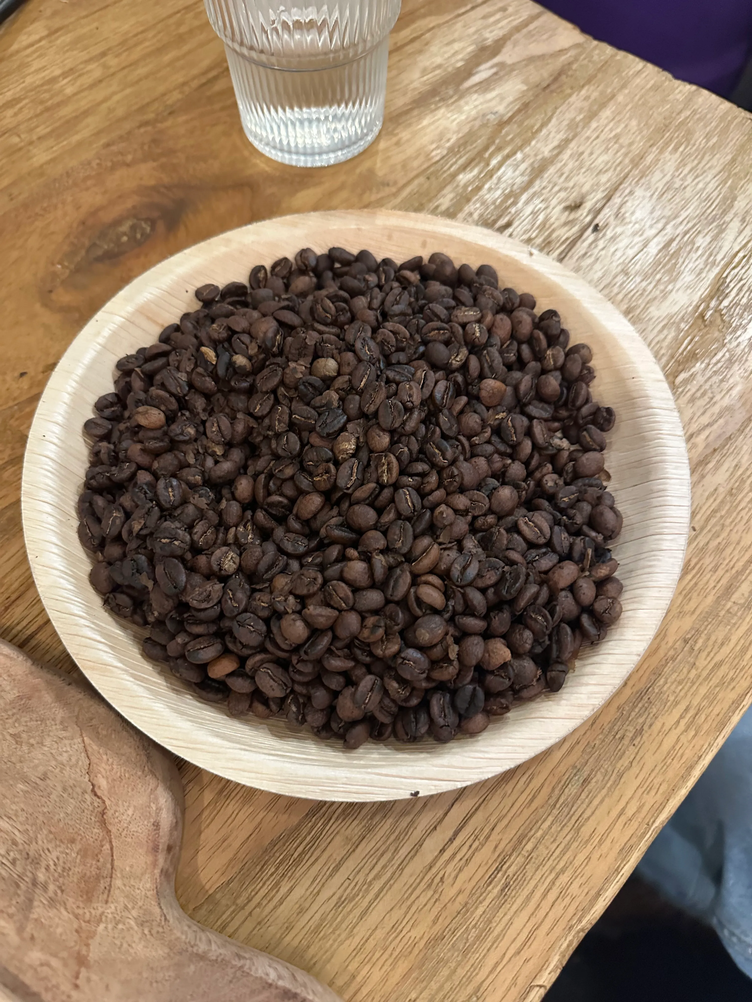 Anschließend mahlen wir die Kaffeebohnen und probieren gemeinsam. Alles an einem großen Holztisch (Tafel).