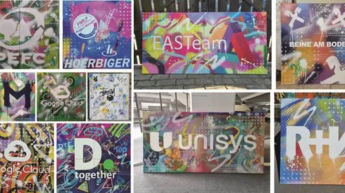 Ihr könnt zusätzlich zur Wand auch Leinwände (im Format ca. 80x80cm) für das Office, zu Hause etc. besprayen. Dazu fertige ich Klebeschablonen mit Logos, Motiven oder Slogans nach Eurem Belieben und positioniere diese auf die weiße Leinwand! Ihr malt diese dann vollflächig bunt an. Ich nehme das Bild dann mit in mein Studio, ziehe die Klebeschablone ab wodurch das weiße Logo wieder zum Vorschein kommt und verfeinere die Leinwand dann noch mit Farbspritzern. Mehrere Leinwände können auch zu einem größeren Bild zusammengestellt werden, z.B. 4 Leinwände zu einer Wand von 1,6m x 1,6m.