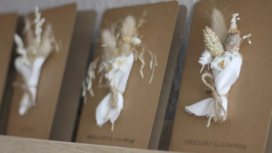 Zu Beginn wirst Du herzlich begrüßt und erhältst eine kurze Einführung in die Materialien und Gestaltungsmöglichkeiten. Anschließend kannst Du die Karten frei gestalten: Trockenblumen werden arrangiert und mit verschiedenen Papieren, Farben und Stempeln kombiniert. Für Schriften, Texte und kleine Details stehen unterschiedliche Stempel zur Verfügung – eine schöne Handschrift ist daher nicht erforderlich. Während des gesamten Workshops gibt es kreative Impulse, Tipps zur Umsetzung und Unterstützung bei Fragen. Der Kurs ist offen gestaltet und lässt viel Raum für eigene Ideen in entspannter Atmosphäre.