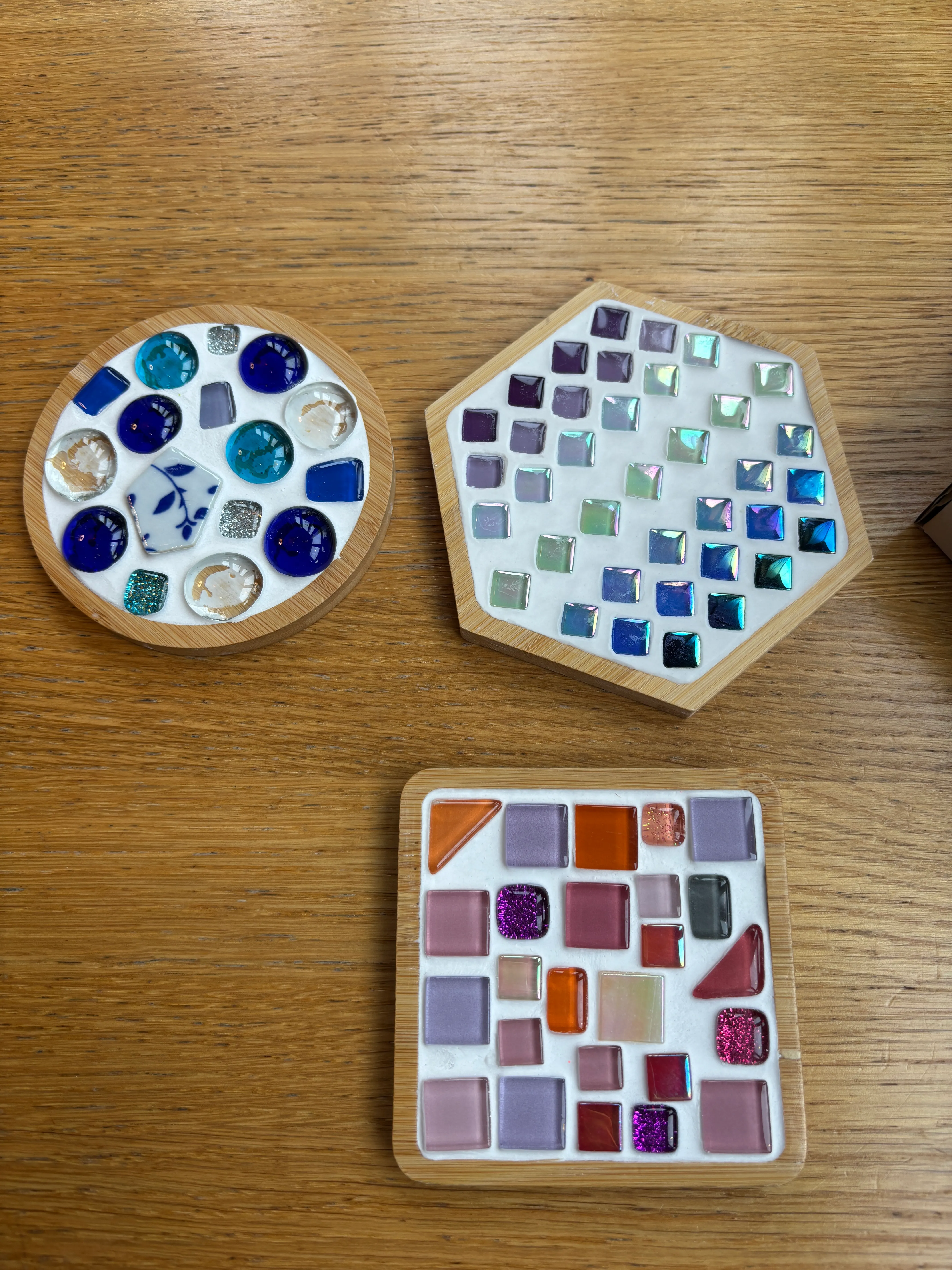 Mosaik ist eine kreative Technik, bei der bunte Mosaiksteinchen und Glasperlen zu einzigartigen Mustern und Bildern zusammengesetzt werden. In diesem Workshop gestaltest Du 3 individuelle Holz-Untersetzer oder 1 Holztablett in verschiedenen Formen und lernst die Grundlagen des Mosaiklegens.