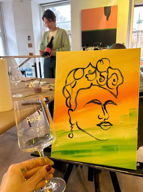 Bei unserem Malen & Wein - Event in Freiburg erlebt eure JGA-Gruppe Kunst und Kulinarik in perfekter Harmonie. Für dieses Event sind absolut keine Vorkenntnisse notwendig - der gemeinsame Spaß steht im Vordergrund! Wählt eure Farben, schnappt euch einen Pinsel und legt los. Die Session wird begleitet von guter Musik und einer Weinverkostung mit regionalen Bio-Weinen und Piwi-Crémants.