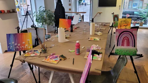 - Wir schenken euch fünf feine Bio-Weine und Crémants aus der Region aus, während ihr euer Werk zu guter Musik malt. Wir haben auch alkoholfreie Alternativen für euch!