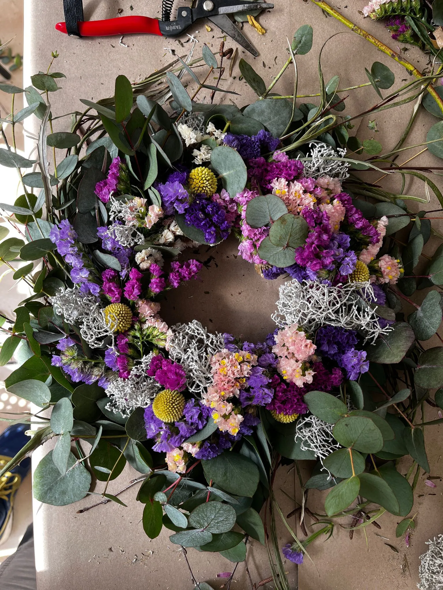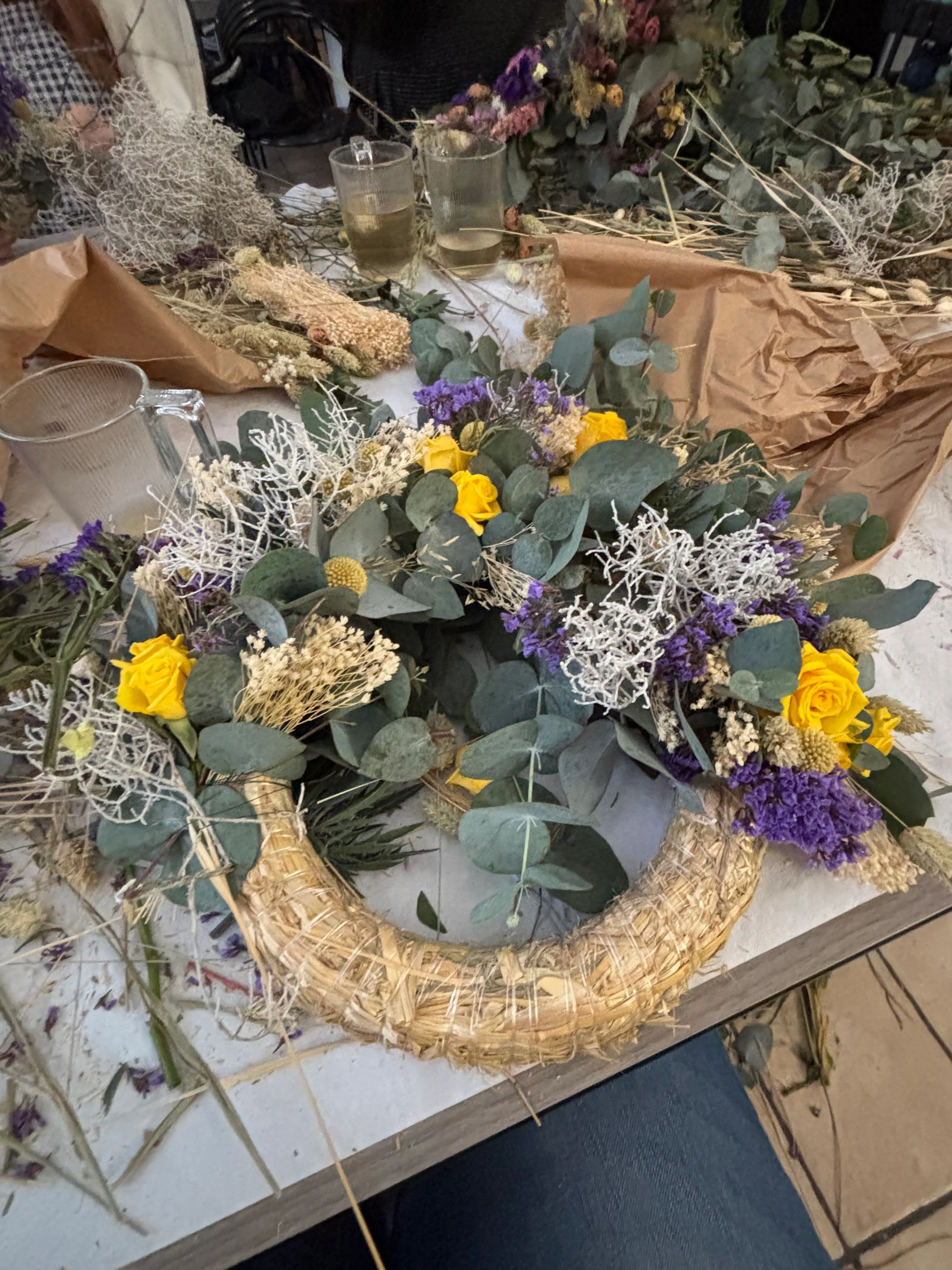 Wir arbeiten mit verschiedenen Trockenblumen und -gräsern und frischem Eucalyptus.