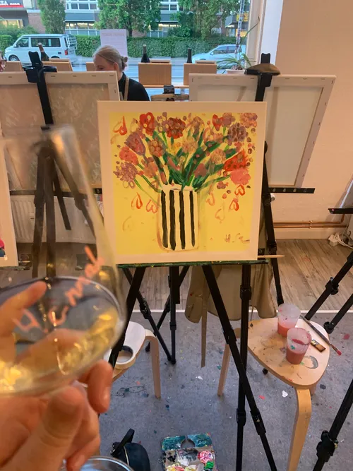 Unsere Malsession mit Weinprobe in Hamburg folgt keinen strengen Regeln, sondern ist von einer lockeren Atmosphäre geprägt, welche die eigene Kreativität sprudeln lässt. Während Du Deine Kunstwerke mit Acrylfarbe auf Leinwand bringst, bringen wir Dir unsere ausgesuchten Weine.