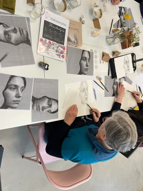 Ich bin Alessia Sinopoli, porträtierende Künstlerin mit einer tiefen Leidenschaft für das Festhalten von Menschen, Gesten und Geschichten. Meine Werke entstehen in einem kraftvollen Dialog zwischen technischer Akribie und freier, intuitiver Form: Ich arbeite mit feiner Schraffur, experimentiere mit Farbe, Blattgold und Mixed Media und lasse in manchen Bildern surreale „Doodles“ einfließen — sie tragen Träume und irgendwelche Impulse in die Portraits. Mein Prozess wurzelt in Neugier auf Menschen, ihre Wandelbarkeit und innere Welt. Ich biete Workshops und Kurse an, in denen du lernen kannst, mit Bleistift, Farbe und Intuition zu arbeiten, und lade dich ein, deinen individuellen Stil zu entdecken und mitzugestalten.