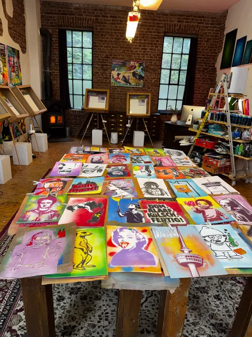 Der Kurs findet im Atelier des Künstlers statt, in einer fast 100 Jahre alten Backsteinhalle an der Steinstraße in Köln-Porz. Die Location hat drei Meter hohe Fenster, viel Licht und echtes New-York-Flair. Sie bietet ausreichend Platz für bis zu 15 Teilnehmende und ist mit allem ausgestattet, was du für einen Stencil-Workshop brauchst: Sprühfarben, Schablonen, hochwertige Leinwände, Schutzausrüstung und Getränke.