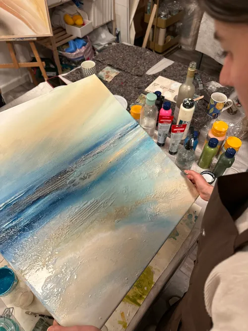 Ich bin Fritzi Ehlert, Künstlerin aus Hamburg mit einer tiefen Leidenschaft für das Meer, Horizonte und die Magie des Wassers. Inspiriert von der transformierenden Kraft fließender Elemente, gestalte ich mehrschichtige Acrylgemälde, in denen sich Abstraktion und Realismus verbinden – eine Fusion aus Tiefe, Bewegung und Ruhe. In meinen Kursen lade ich Dich ein, Deine eigene Verbindung zur Natur zu entdecken: Du lernst, wie man Fläche, Farbe und Struktur nutzt, um atmosphärische Innenräume entstehen zu lassen. Mein Atelier im Grünen verspricht Raum für Kreativität, Austausch und Flow – hier gestaltest Du nicht nur ein Bild, sondern eine persönliche Erinnerung.