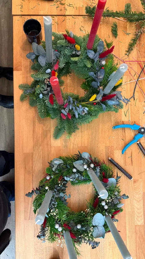 Hier ist jeder willkommen, der sich kreativ ausprobieren und einen entspannten Nachmittag verbringen möchte. Du brauchst dabei keinerlei Vorkenntnisse. Ich zeige Dir Schritt für Schritt, wie Du einen wunderschönen Adventskranz aus Tanne und Trockenblumen bindest.