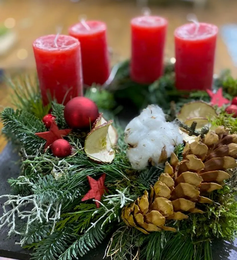 In a Christmas atmosphere, your wreath is made under expert guidance. Traditional, luxurious, modern and imaginative — according to your wishes. We explain wreath wrapping techniques, different types of loops, weaving cones, balls, etc. and securely attaching candles. You can only decorate the green wreath or wrap it yourself “for the experienced” and then decorate it out.