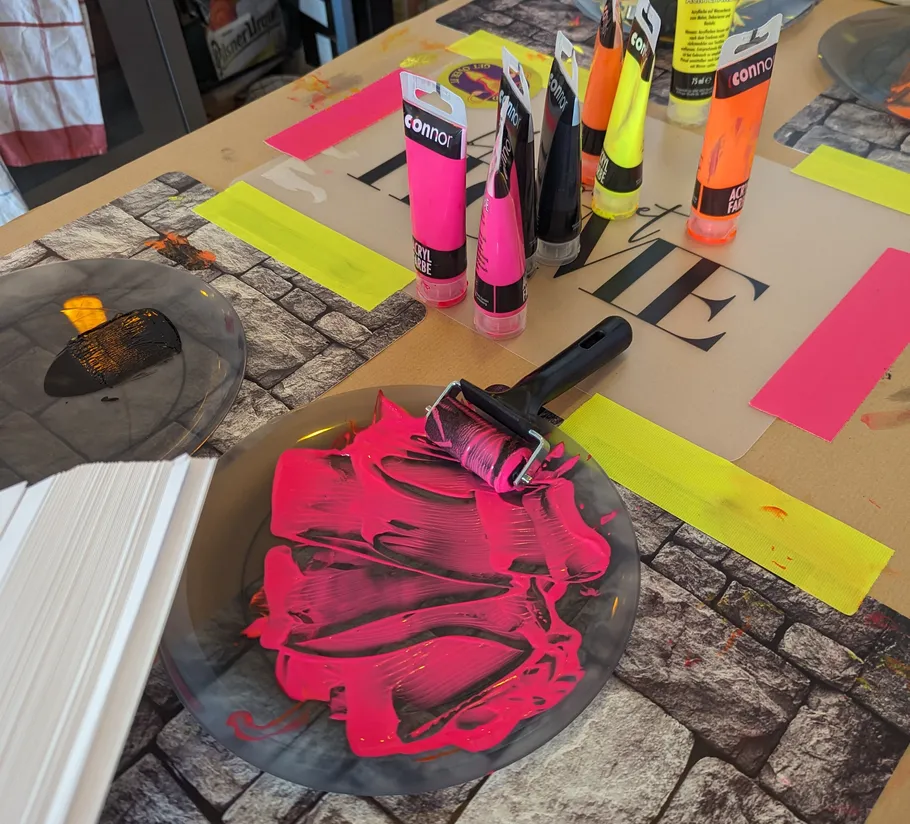 Now get creative yourself: You work on your own design or stencil and, as soon as you're satisfied, it's off to the printing station. There you can print your design with strong neon colors — hands-on, intuitively and with lots of fun.