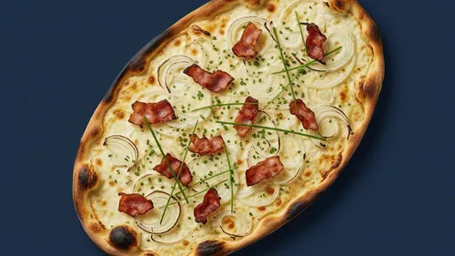 Knusprig-dünner Flammkuchenboden frisch aus dem Ofen – wahlweise klassisch nach Elsässer Art mit Crème fraîche, Speck und roten Zwiebeln oder als feine vegetarische Variante mit frischem Gemüse der Saison und aromatischen Kräutern. Ein kulinarisches Highlight, das die Cocktailkreationen im À Boire perfekt ergänzt.