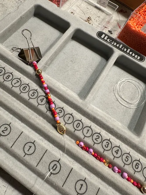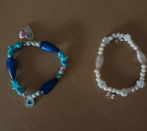 - zusätzlich zu den zwei Perlenarmbändern kannst du eine Perlenkette gestalten