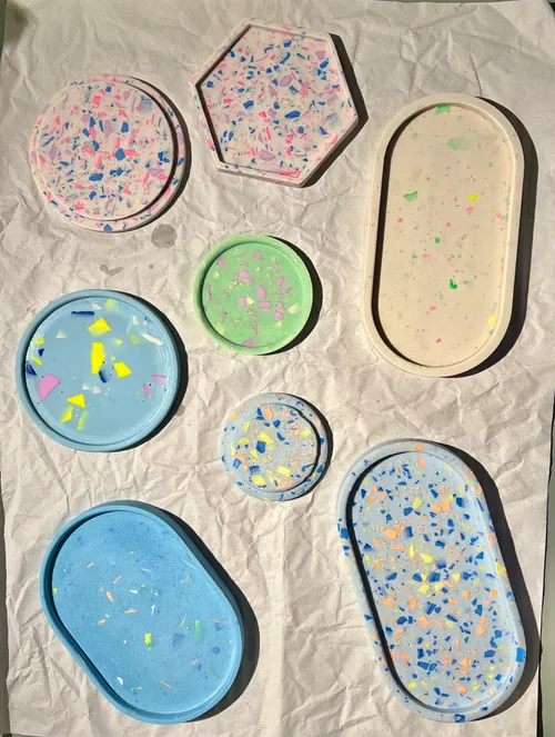 You will learn about the terrazzo technique with the trendy Jesmonite material. Step by step, we'll show you how to mix and make terrazzo chips in two favorite colors. In addition, we bring many more chips, and you can swap with other participants for even more colorful combinations. Then pour your desired mold, e.g. a bowl, a saucer, a small plate or a smiley face. While the objects harden, there is time for questions, exchanges or a short break with snacks and drinks. We then give your design the perfect finishing touch with a lot of handwork. You take your work straight home: unique and handmade, according to your individual taste.