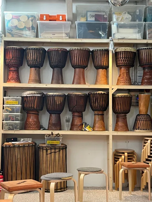 On the beat floor, there are lessons for West African drum djembes and dunduns (bass drums).